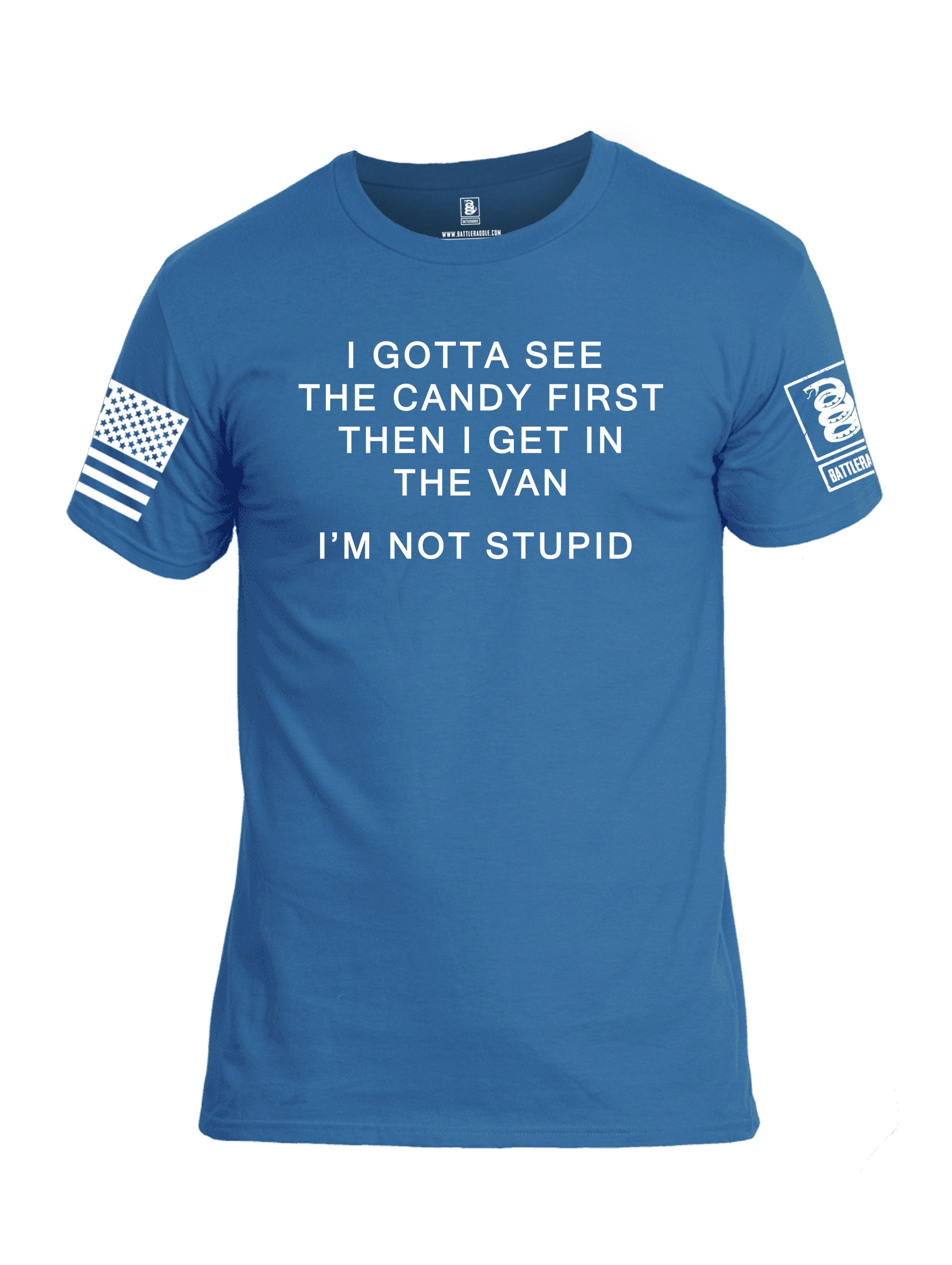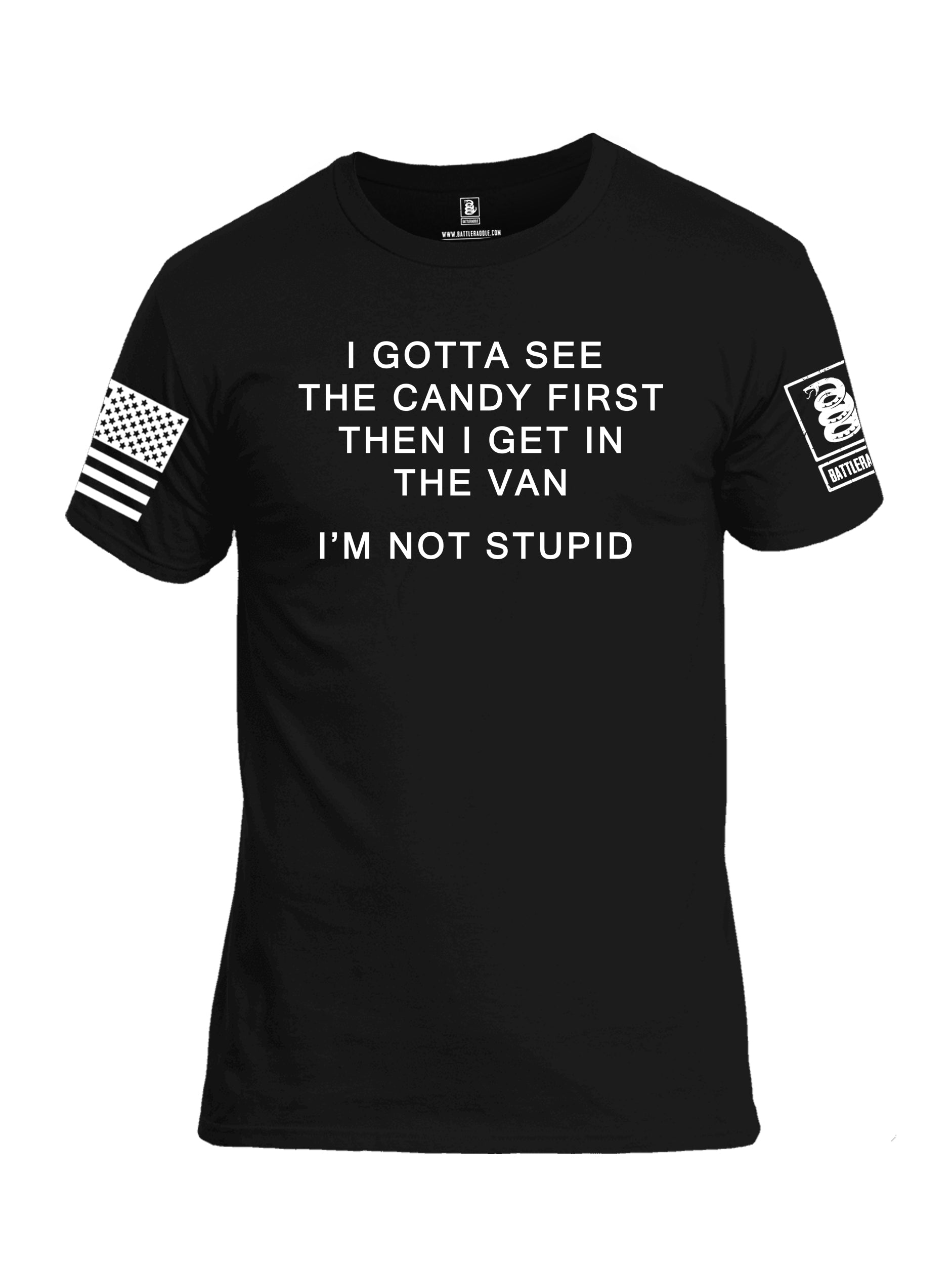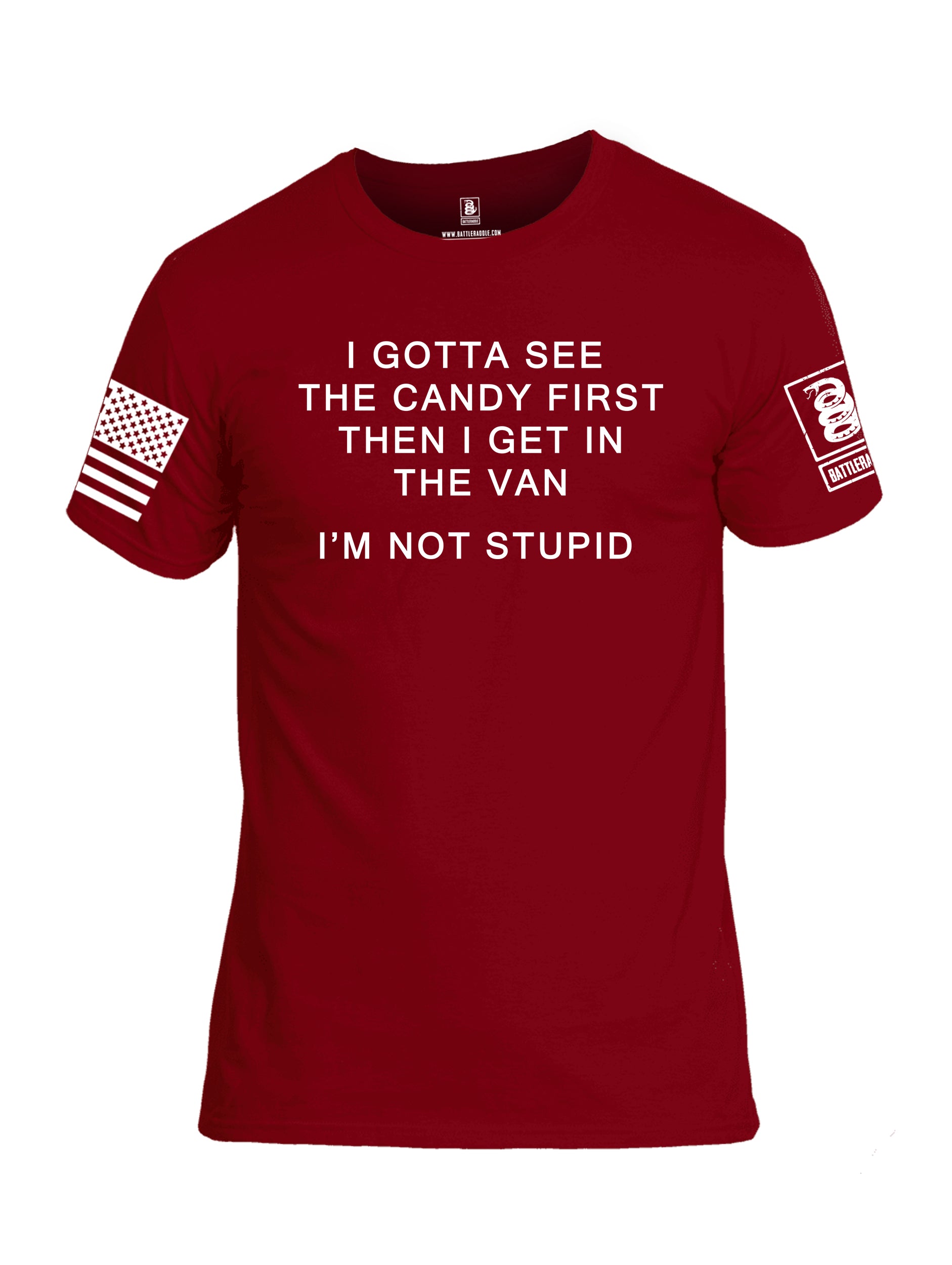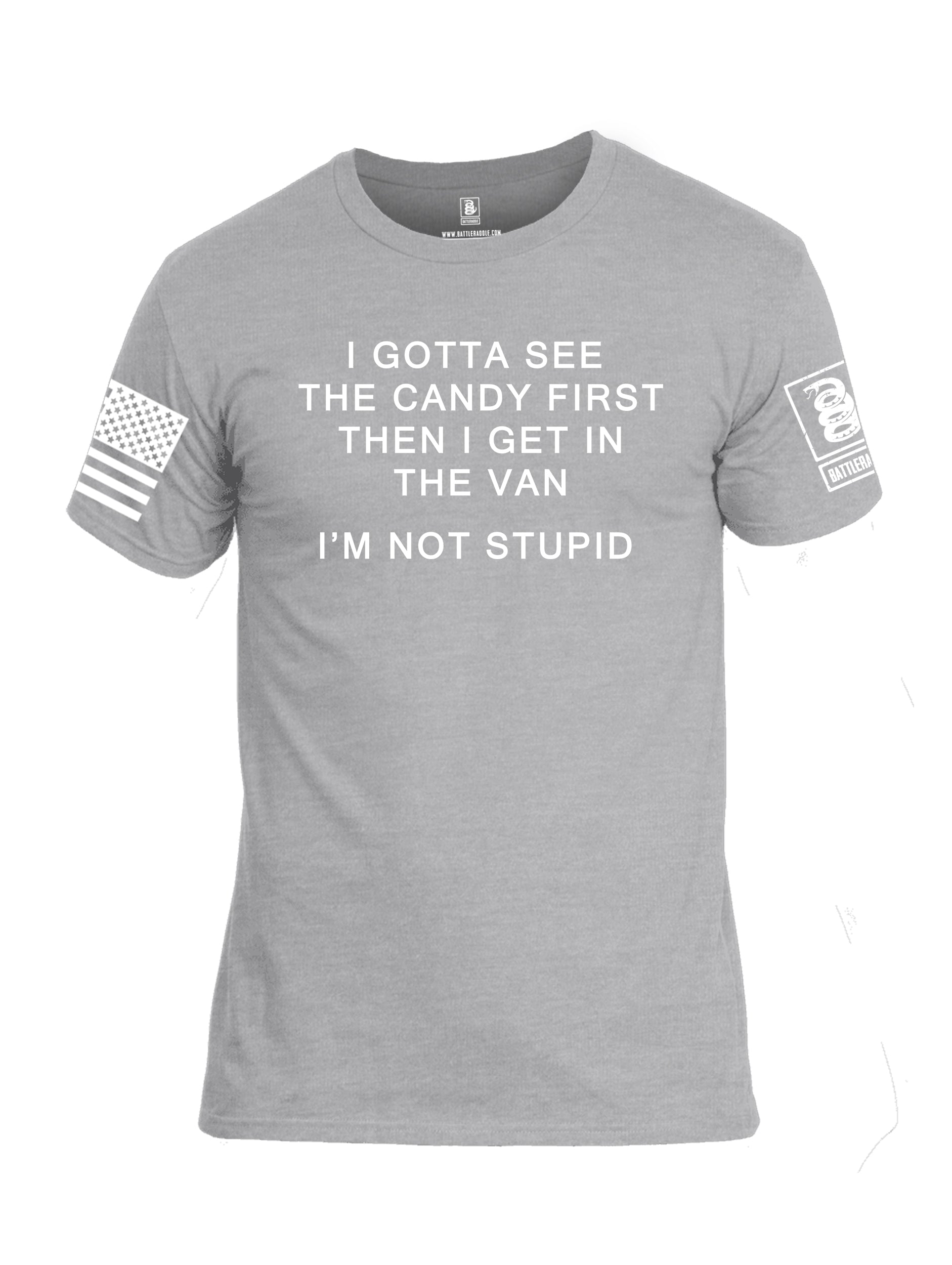 Battleraddle I Gotta See The Candy First Then I Get in the Van Im Not Stupid White Sleeve Print Mens Cotton Crew Neck T Shirt