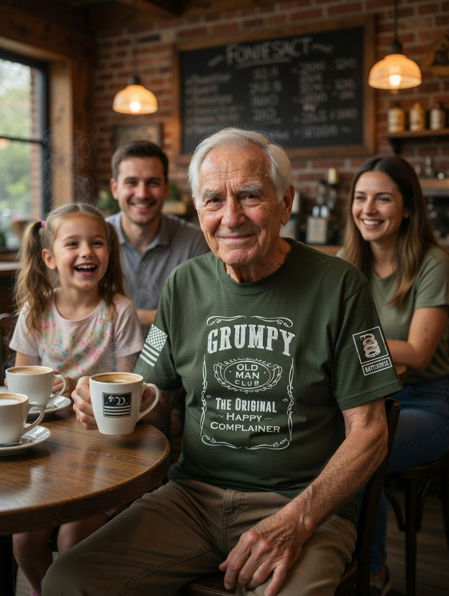 Battleraddle Grumpy Old Man Club The Original Happy Complainer White Sleeve Print Mens Cotton Crew Neck T Shirt