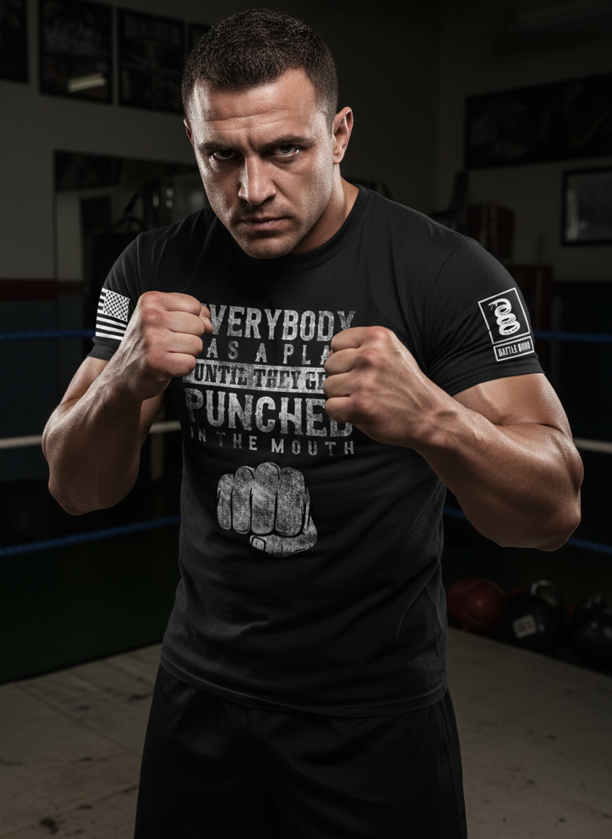 Battleraddle Everybody Has A Plan Until They Get Punched In The Mouth White Sleeve Print Mens Cotton Crew Neck T Shirt