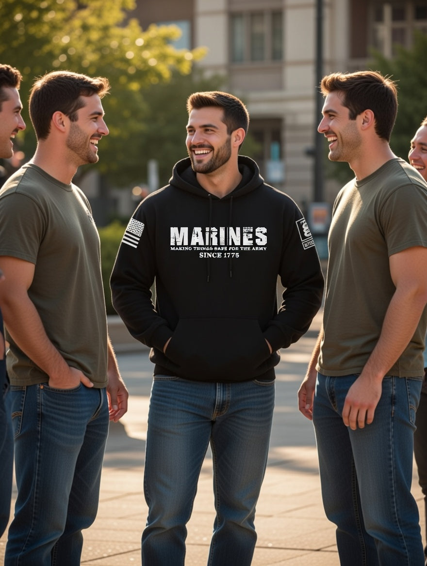 Battleraddle Marines Making Things Safe For The Army Since 1775 White Sleeves Uni Cotton Blended Hoodie With Pockets