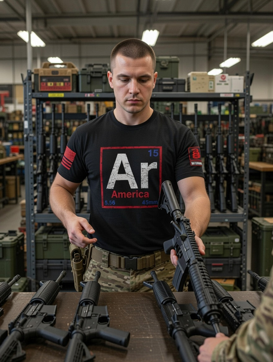 Battleraddle Periodic Table Of Elements AR15 15.56 45mm America Red Sleeve Print Mens Cotton Crew Neck T Shirt