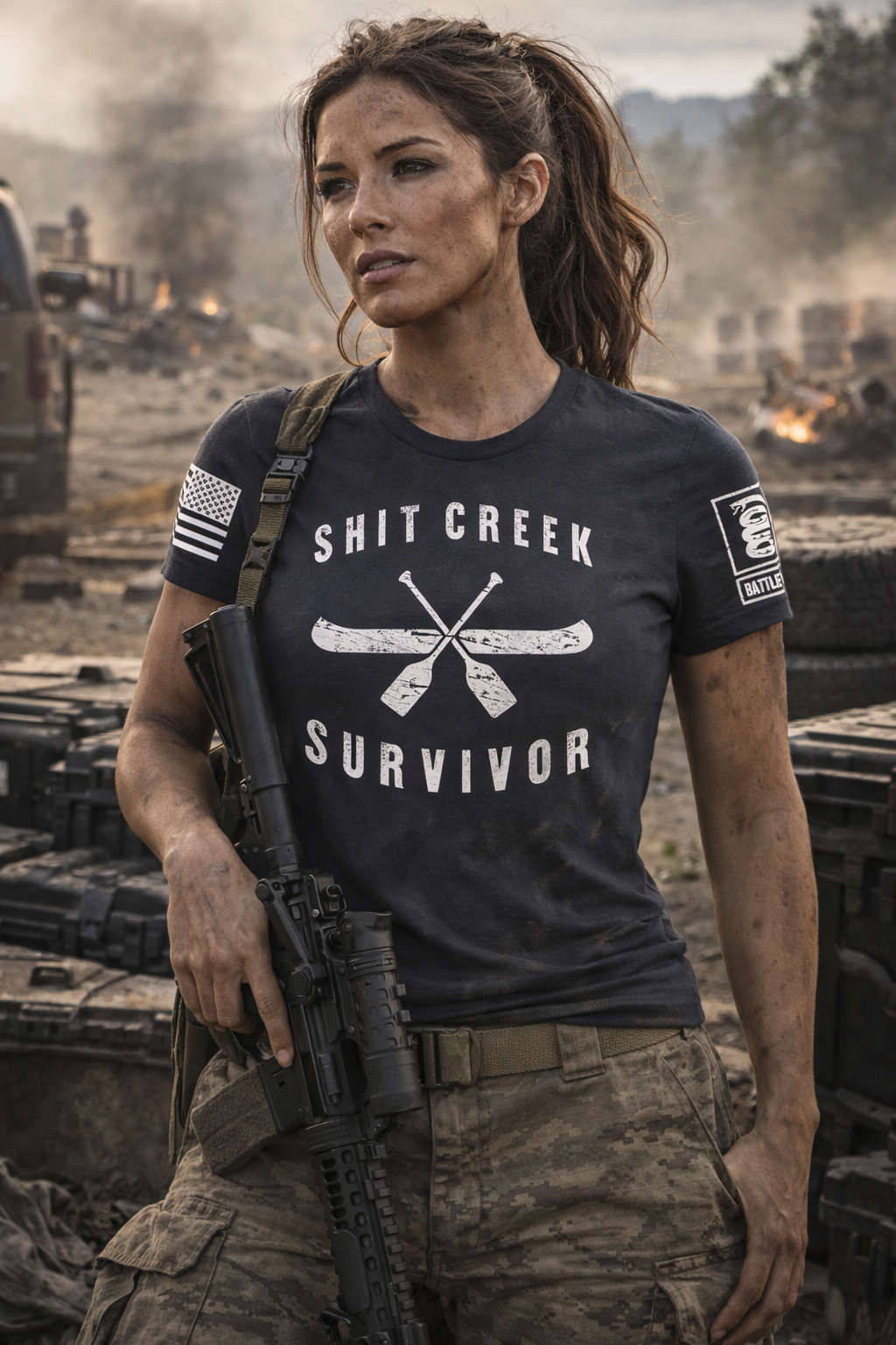 Battleraddle Shit Creek Survivor White Sleeve Print Womens Cotton Crew Neck T Shirt