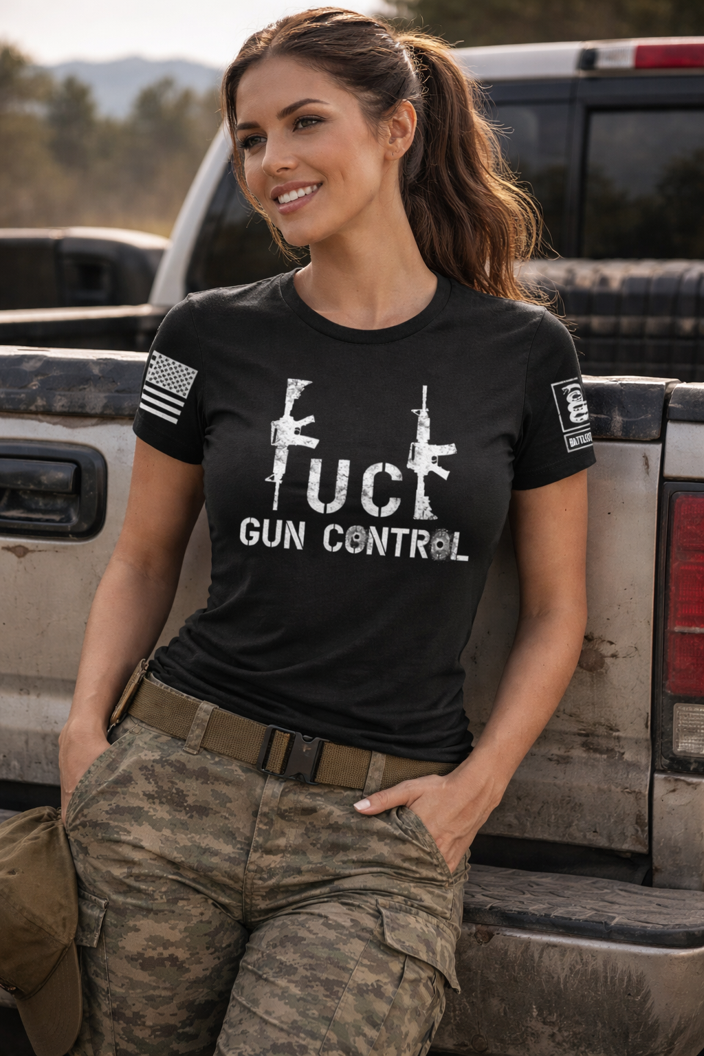 Battleraddle Fuck Gun Control Grey Sleeve Print Womens Cotton Crew Neck T Shirt